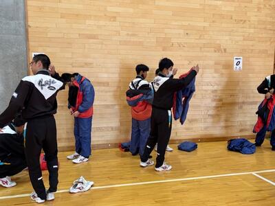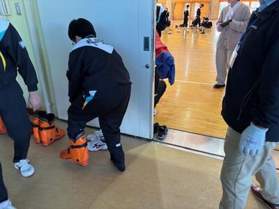 2年生が来年実施するスキー宿泊学習のスキーウェアの試着を行いました。