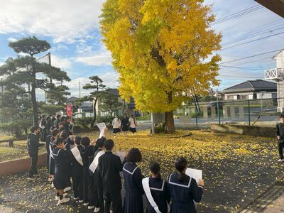 環境・整美委員の生徒や野球部・柔道部など有志の生徒が落ち葉掃きを行っていますが、
